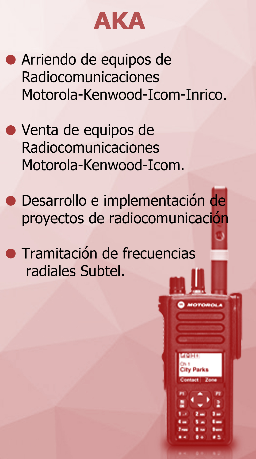Grupo AKA la componen empresas con una clara vocación de servicios en entregar soluciones concretas y confiables en el área de las telecomunicaciones. Proyectos, implementación y arriendos de equipamiento de radiocomunicación. Nuestro trabajo está orientado en ser parte integral en dar soluciones a empresas productivas, empresas de seguridad, entidades públicas y privadas, empresas productoras de eventos, empresas de transporte, etc.